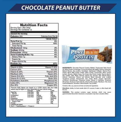 PRODUCT DESCRIPTION 名称Pure Protein Bars, Chocolate Peanut Butter, 20 g Protein, 1.76 oz, 12 ct 商品説明 チョコレートピーナッツバター風味の20gプロテインバーです。