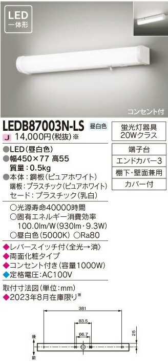 LEDB87003N-LS 東芝ライテック 20タイプ 流し元灯 [LED昼白色][コンセント付][蛍光灯ランプ器具20Wクラス][棚下・壁面兼用][セード・プラスチック・乳白]